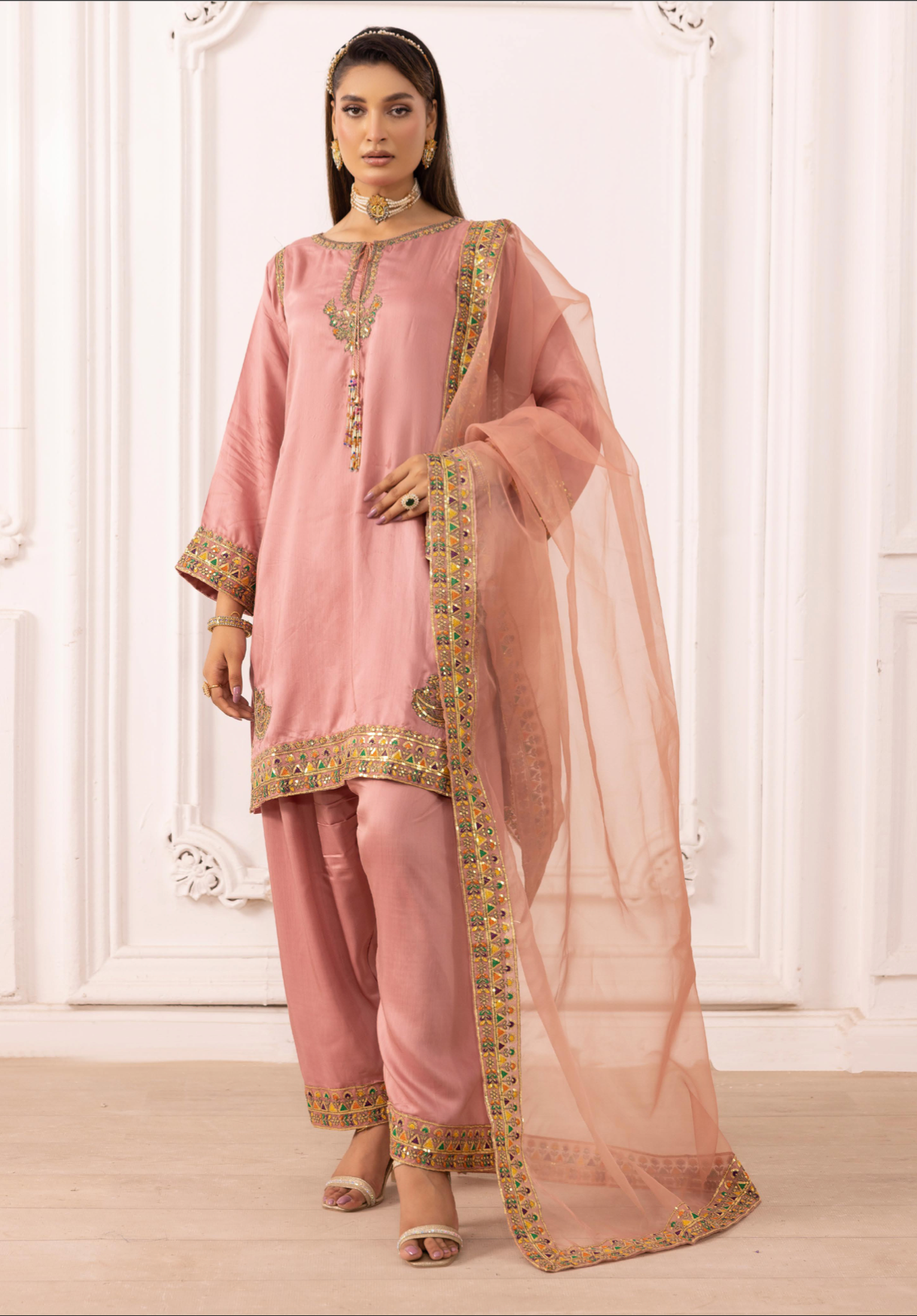 Viscose Silk Suit with Embroidery and Sequin Work. Comes with Farshi Shalwar Trousers and an Embroidered and Sequin Embellished Soft Organza Dupatta