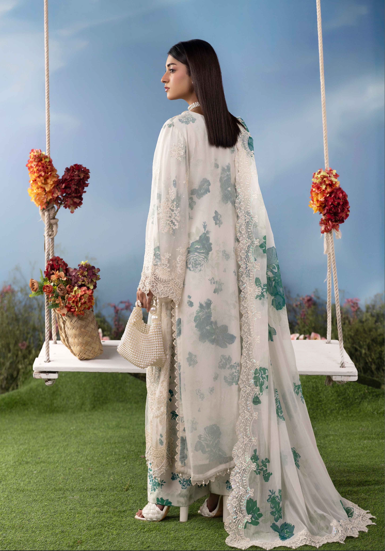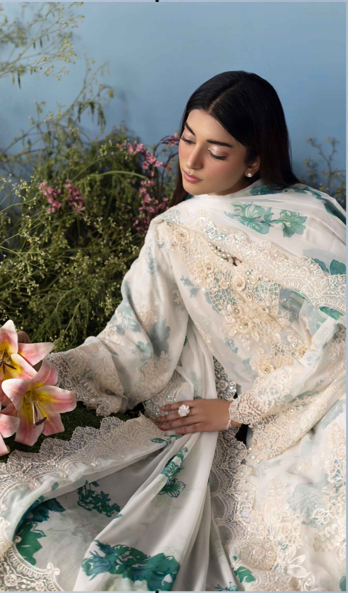 Raw Silk Lined Premium Chiffon Maria B Design Inspired Suit with Heavy Embroidery, Stone, Sequin, Pearl and 3D Flower Work. Comes with Wide Leg Palazzo Trousers and a Digital Printed and Embellished Premium Soft Chiffon Dupatta